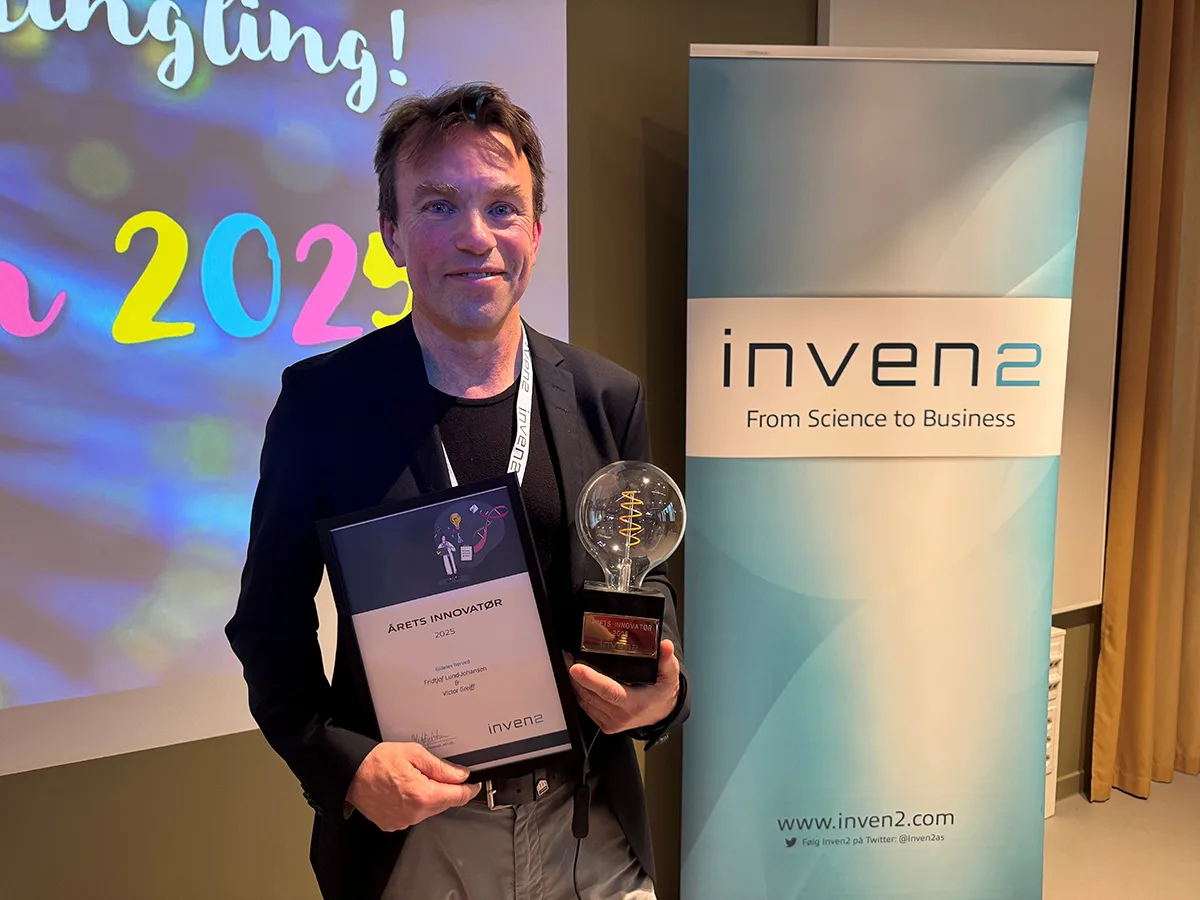 Fridtjof Lund-Johansen mottar prisen «Årets innovatør». Foto: Jannicke Kristoffersen, Inven2.